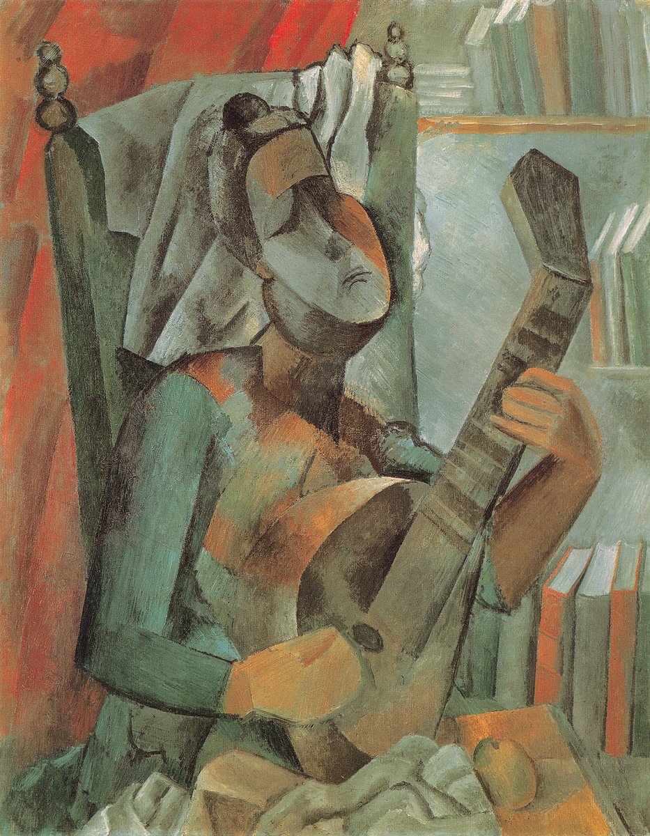 In der Frau mit der Mandoline liegt der Zusammenhang der dargestellten Gegenstände und der Gestalt an der Oberfläche, denn er geht aus dem Sujet selber hervor: Die Frau spielt ein Musikinstrument, und die Bücher dienen als Attribut der intellektuellen Atmosphäre der Hausmusik. Andererseits kontrastieren die Reihen der Bücherregale durch ihre geordnete Regelmäßigkeit mit dem herabfallenden scharlachroten, romantisch flammenden, Strom des Vorhangs und den über die Stuhllehne rieselnden Falten des weißen Stoffes, die den emotionellen Zustand der Musikerin ausdrücken, die sich selbstvergessen dem Strom der Töne hingibt. Den Zusammenfluss der Musik und der Emotion der Frauenfigur gestaltet Picasso, indem er den Umriss der Frauengestalt dem Instrument gleichsetzt (es handelt sich eher um die Symbiose einer Laute und einer Gitarre als um eine kleine, elegante Mandoline), und sogar durch die Analogie des Aufbaus des Kopfes der Gestalt und des halbsphärischen Körpers der Mandoline.