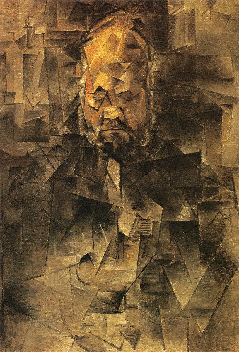 Die auf verschiedene Weise geneigten, winklig umrissenen, rauchfarbenen und halbdurchsichtigen Flächen werden ähnlich Metallspänen um einen Magneten angeordnet, um sich so auf eine unbegreifliche Weise zu dem auf den ersten Blick erkennbaren Porträt Ambroise Vollard zusammenzufügen. Die Ränder der Flächen werden zu Elementen der Zeichnung, erstellen die Charakterzüge des Gesichts, die Details der Kleidung: den Knopf, den Kragen der Jacke, das Tuch in der Brusttasche und das Interieur: eine Flasche auf dem Tischchen. Als löse er das Problem der Quadratur des Kreises, baut Picasso die Kuppel des Kopfes des Modells durch eine aus der anderen hervorgehenden Fläche auf. Mit starken Strichen arbeitet er die Grundlinien und die Maße des schweren schlafenden Gesichts Vollards mit der kurzen, gebrochenen Nase und der harten Mundlinie heraus.