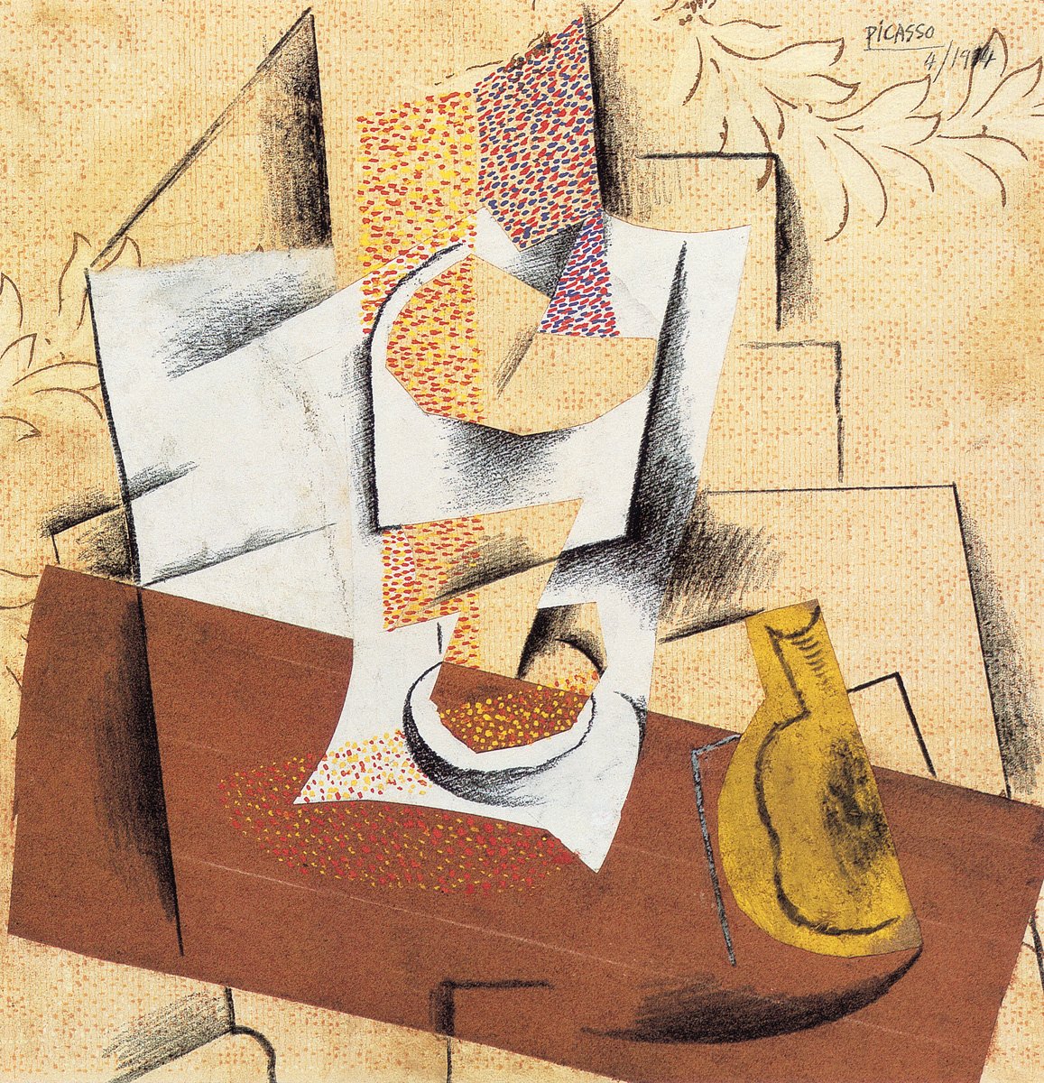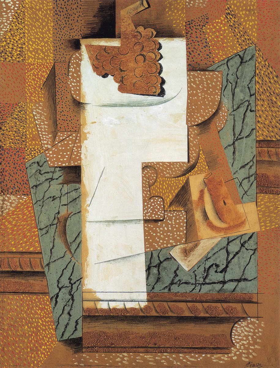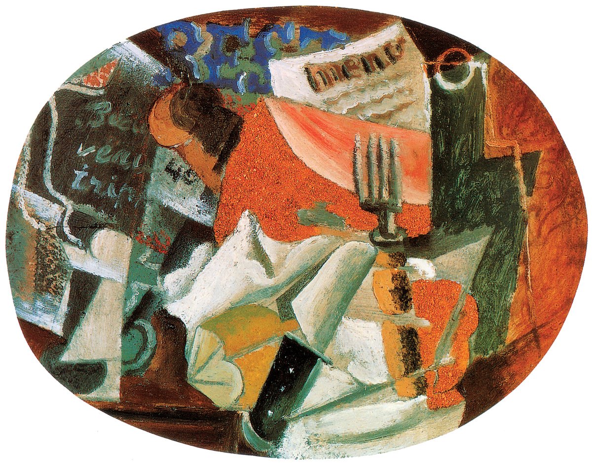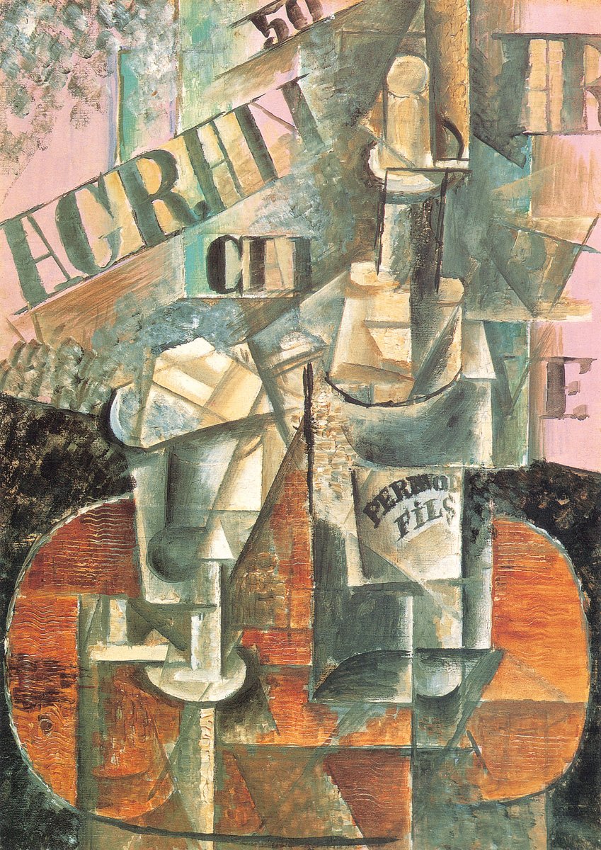 In dem Bild Ein Tischen im Café, das im Frühjahr 1912 geschaffen wurde, gehören die Buchstaben, die im Hintergrund verlaufen, den Reklametexten an, die auf das unsichtbare Glas der Cafévitrine aufgetragen sind, das den Hintergrund des Stilllebens bildet. Dank ihrer Anwesenheit ist das Bild von unzweifelhaft erkennbaren Kennzeichen des modernen, urbanisierten Lebens durchdrungen, während das Motiv der Komposition selbst — die Flasche „Pernod“ und das Weinglas mit dem Zuckerlöffel, die auf dem ovalen Holztischchen stehen — den neuen Geschmack Picassos an der materiellen Konkretheit der Welt offenbart. Der Maler ist sichtlich von dem Kontrasteffekt der Brechungen der körperlosen gläsernen Gegenstände und der dichten welligen Textur in dem warmen Holzton hingerissen. Gleichzeitig ist die Schriftimitation der Vitrinenreklame nicht nur ein Element der Realität, sondern auch einer neuen Poetik: Die Fetzen von Überschriften knüpfen in ihrem Durcheinander wie auch durch ihre räumliche und sinnliche Zugehörigkeit zur Sphäre des Alkohols an die Vorstellung von dem harten und zugleich berauschenden zeitgenössischen Leben an.