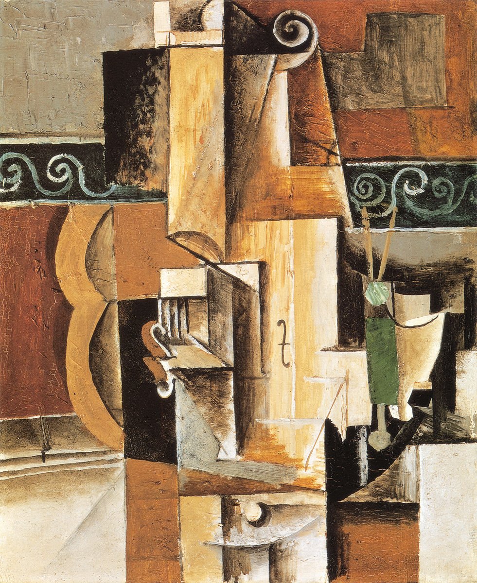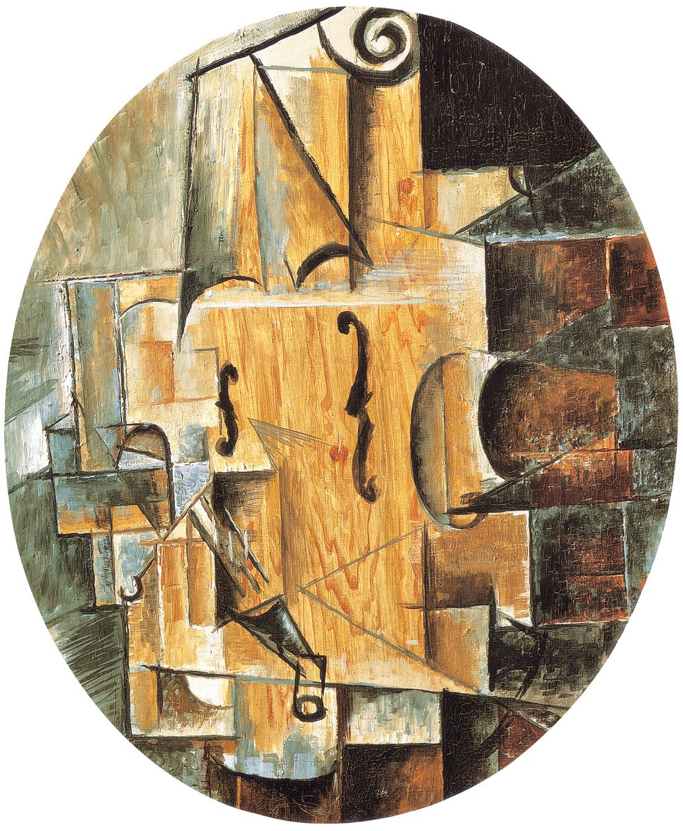 Die Violine ist eines der ersten und harmonischsten Werke dieser Periode. Darin ist, nach den Worten des russischen Kubisten Alexej Gristschenko, „mit einer erstaunlichen Meisterschaft die neue Konzeption des Bildes gelöst, wo die Formen des Gegenstandes, die vom Maler gründlich verarbeitet werden, zu einer klaren, stilistisch vollendeten und aufregenden Komposition zusammengeführt werden; wo die analytisch gewonnenen Elemente in die Malerei eingeführt und zu einem unzertrennbaren, synthetischen Ganzen zusammengeschweißt sind, wo die Perspektive durch die realen Tiefenquerschnitte des Gegenstandes gegeben ist, wo jedes Stückchen der Leinwand unter der Hand eines wahren Malers entstand“.[104] Dieses Bild darf man kaum ein Stillleben im eigentlichen Sinne nennen: Sein konzeptionelles Vorhaben lässt sich eher in dem Begriff „Bild-Sache“ (tableau-objet) ausdrücken, der um diese Zeit von Picasso selbst verwendet wurde. Tatsächlich wird hier das malerische Bild der Violine schon durch die harmonische ovale Form des Gemäldes vorgegeben; und das Instrument ist in seinem Kompositionskern erkennbar dargestellt, seine materiellen Eigenschaften liegen offen zutage, die wellige Textur und die Honigtöne des Holzes wie auch die eleganten Details (die F’s und die Durchbiegungen der Decke). Dieser körperliche Kern tritt dank der Passagen der geteilten Formen, die rhythmisch zu den Rändern des Formats streben, fast sphärisch hervor. Die ganze Komposition gewinnt also ihre Standfestigkeit nicht dadurch, dass der Gegenstand selbst in einer gewissen festen Lage gezeigt wird, und auch nicht wegen des pyramidalen Gerüsts, sondern durch den kühnen Aufbau der ovalen, tektonisch sehr komplizierten Komposition, die durch ihren Kern, ähnlich einem Bogen durch den Schlussstein, gefestigt ist.