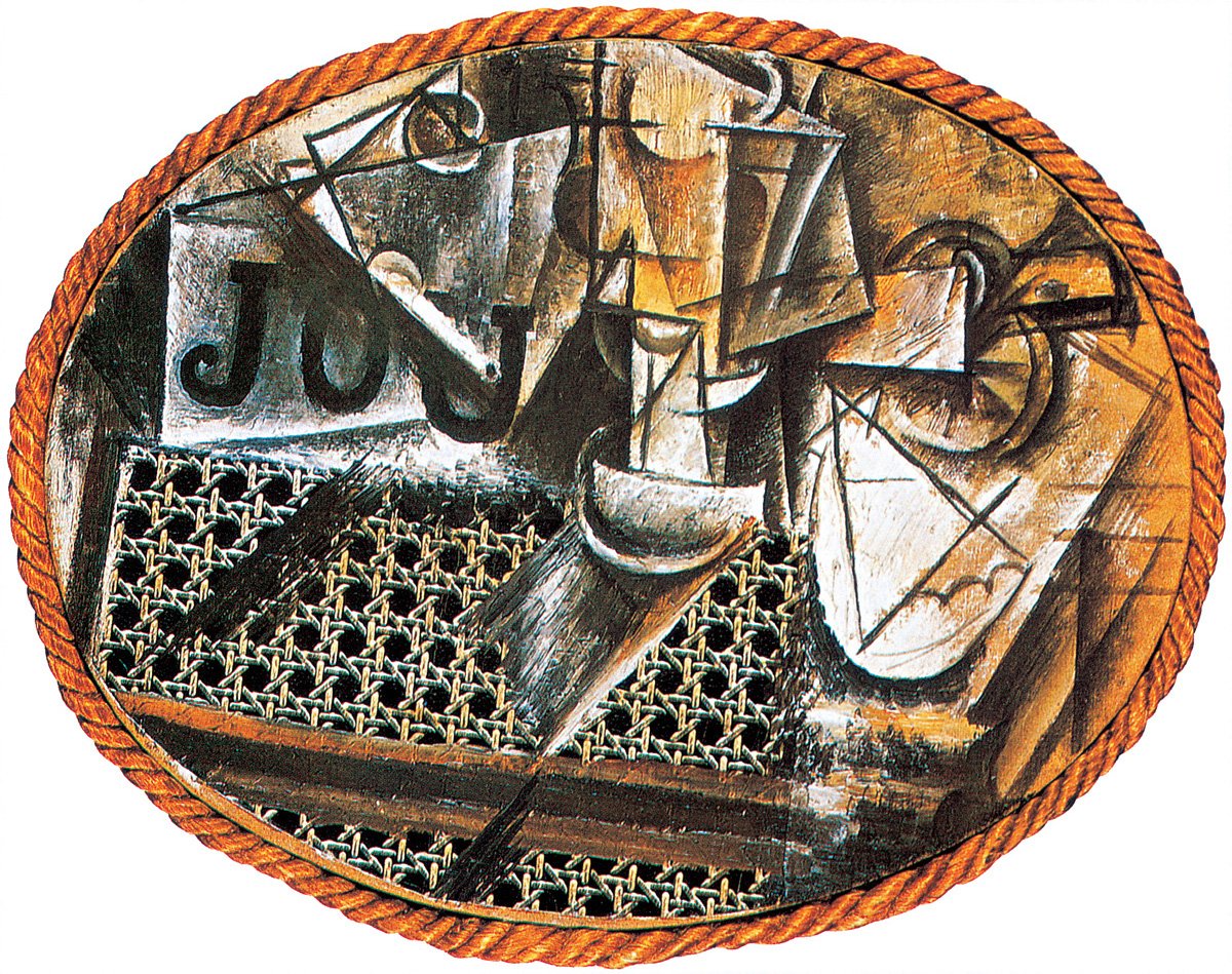 Mit einer erstaunlichen Freiheit, Findigkeit und Grazie wendet Picasso das Gesetz der plastischen Metapher in der die Möglichkeiten der Malerei revolutionierenden Collagetechnik an, d. h. der Papieretiketten, die er selbst so erklärte: „Außer den Rhythmen ist der Unterschied der Texturen eines der Dinge, die uns am stärksten in der Natur in Erstaunen versetzen: Die Transparenz des Raumes steht der Undurchsichtigkeit des in ihm eingeschlossenen Gegenstandes gegenüber, die Mattheit der Tabakschachtel neben der Porzellanvase; und dazu noch das Verhältnis der Form, der Farbe und des Volumens zur Textur. Wozu sollte man diese Unterschiede durch eintönige Pinselstriche der Ölmalerei zu erreichen suchen und damit das Sichtbare durch die Vielfalt der qualvollen und rhetorischen Bedingtheiten die Perspektive u. dgl. ‘wiedergeben’? Das Ziel von papier collé bestand darin, dass man zeigen wollte, dass verschiedene Stoffe in die Komposition eingehen können, indem sie im Bild zur Wirklichkeit werden, die sich mit der Natur messen kann. Wir strebten danach, uns vom ‘trompe-l’œil’ zu befreien, um ‘trompe-l’esprit’ zu erreichen.“[107] Keine von den ins papier collé eingehenden Komponenten wird in ihrem direkten Sinne genommen; es sind allesamt Allegorien und Metaphern.