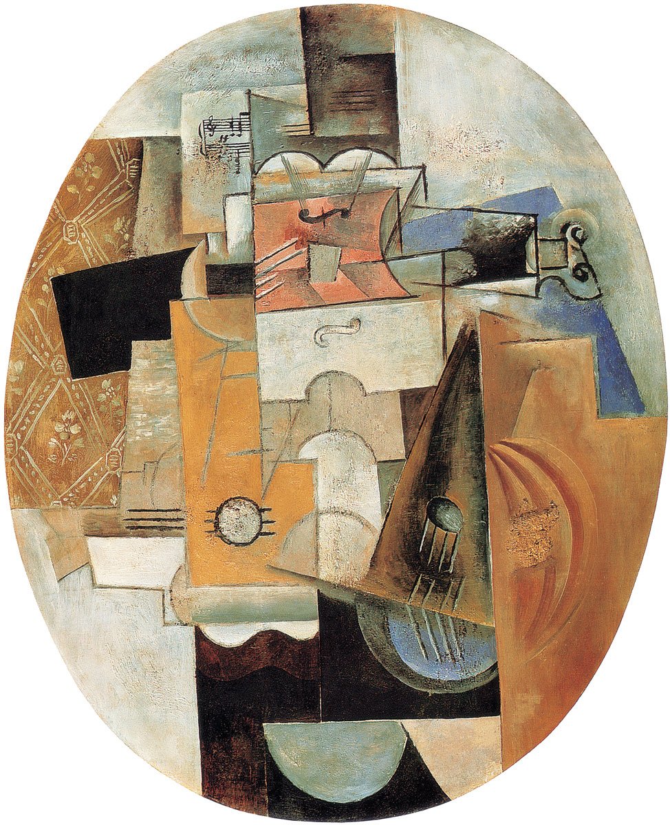 Die labile ovale Form der Leinwand, die nicht aufstellbar, sondern nur an die Wand zu hängen ist, brachte den Maler in die Versuchung, neue Kompositionsprinzipien für Strukturen zu finden, die so aussehen, als wären sie aufgehängt oder schwämmen im Raum des ovalen Formats selbst. So wird in dem Gemälde Musikinstrumente, an dem Picasso in demselben Sommer in Sorgues arbeitete, eine Kaskade von Formen, die den Umrissen, den Farb-, Raum- und Fakturencharakteristiken nach unterschiedlich sind, dauerhaft auf der Kreuzung zweier schwarzer Streifen befestigt, die als Fundament der Konstruktion dienen. Die ausdrucksvollen Kennzeichen der Instrumente weisen auf die Zugehörigkeit des reich entfalteten Ensembles der formalen Elemente der rosaweißen Violine, der gelbbraunen Gitarre und der dunkelgrün-blau-cremefarbenen Mandoline hin. Sie sind hier mit den dissoziierten Merkmalen ihrer charakteristischen Realitäten dargestellt — den Maßen, Ebenen und Oberflächen, Umrissen und Konstruktionsdetails, mit einer Art bildlicher Zeichen. Aber für Picasso sind diese Zeichen auch gewisse sinnliche Äquivalente, wovon ihre nicht natürliche, sondern ihre subjektive bildliche Färbung zeugt (scharfrosa, samtigblau und -grün, tiefbraun und sandgelb) und die Einführung eines stark fühlbaren Reizerregers, dem Gips, dessen Relief den Effekt eines „Geräusches“ hervorbringt. Gerade in Sorgues, wie aus den Notizen in seinem Skizzenblock ersichtlich ist, bemüht Picasso sich, „das Gleichgewicht zwischen der Natur und der Vorstellung zu finden“.[105]