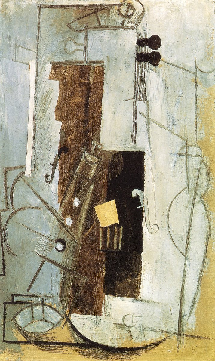Zu den Arbeiten dieser Periode und Richtung gehören die Bilder Violine und Gläser auf einem Tisch und Violine und Klarinette, in denen das deutlich dominierende Konstruktionsprinzip durch die flachen frontalen Pläne auf den Zusammenhang der Technik des papier collé und mit den Skulpturkonstruktionen hinweist. Aber während das erstgenannte Bild als imposante, sicherere und mehr dekorativ entwickelte Version der kleinen ovalen Violine aus dem Moskauer Museum erscheint, ist das dem Äußeren nach schlichte Bild Violine und Klarinette eine meisterhafte Studie des neuen Aufbaus der Komposition und die auf das Äußerste reduzierte Formel der neuen bildlichen Konzeption der Malerei Picassos (oder noch umfassender, seines plastischen Schaffens), die im Laufe der sechs Jahre seiner kubistischen Periode reifte. Eine absolut flache schwarze Fläche weicht hinter eine braune zurück, mit der sie fest durch die Inkrustation des kleinen cremefarbenen Quadrats zusammengekettet wird.