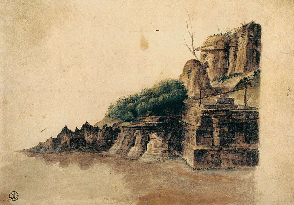 49. Marco Basaiti, vers 1470-1530, Italien. Paysage avec une côte rocheuse, vers 1507-1512. Aquarelle, 20,3 x 27,4 cm. Galleria degli Uffizi, Florence. Première Renaissance.