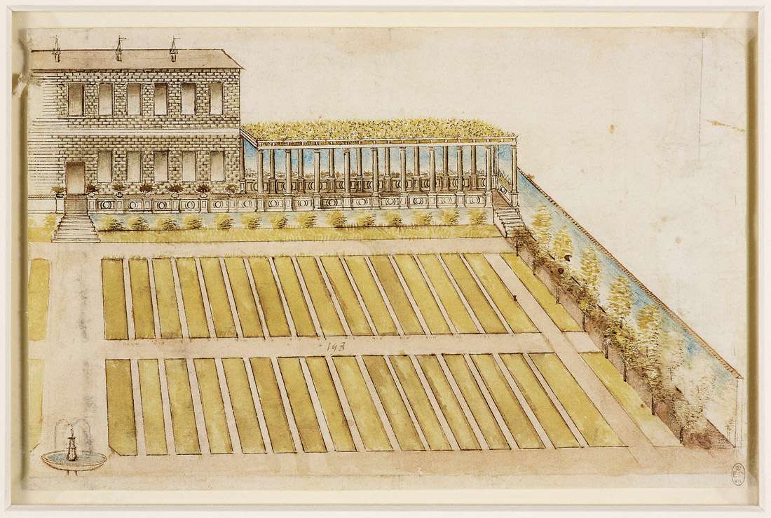 51. Anonyme, Italien. La Façade d’une ville avec une colonnade rustique et un jardin clos, date inconnue. Plume et encre, craie rouge et aquarelle, 17,4 x 27 cm. The Royal Collection, Londres.