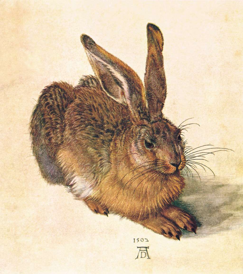 54. Albrecht Dürer, 1471-1528, Allemand. Le Jeune Lièvre, 1502. Aquarelle et gouache sur papier, 25 x 22,5 cm. Grafische Sammlung, Albertina, Vienne. Renaissance du Nord.