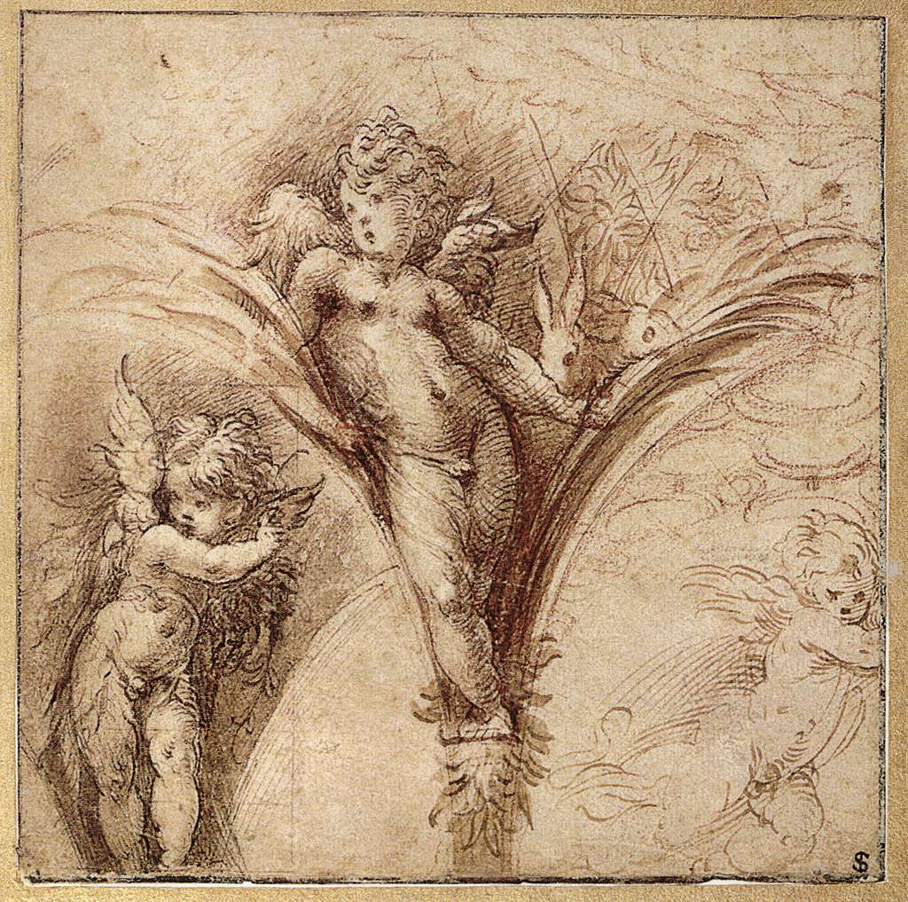 58. Le Parmesan (Francesco Mazzola), 1503-1540, Italien. Trois Études de Putti, vers 1520. Plume et encre brune, lavis brun et craie rouge, 15,7 x 15,6 cm. The Morgan Library and Museum, New York. Maniérisme.
