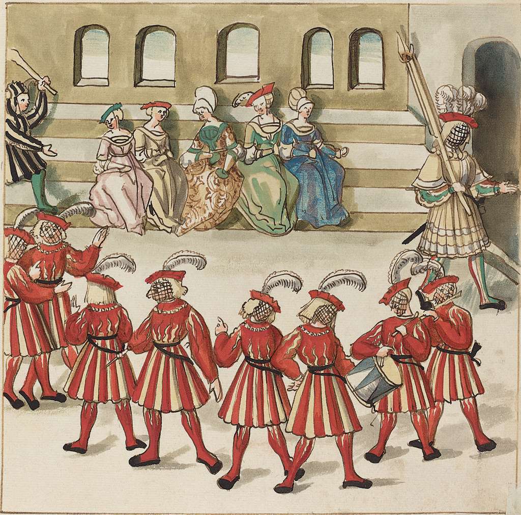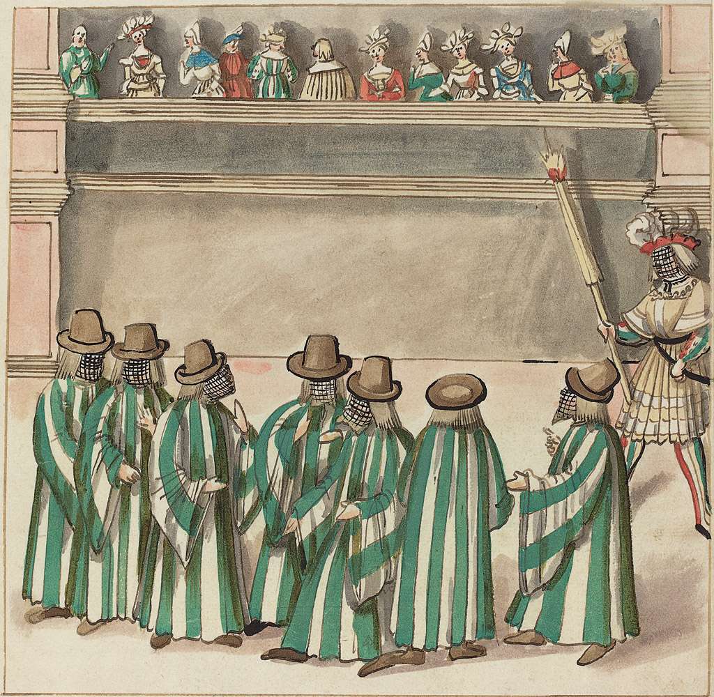 72. Anonyme, Allemand. Mascarade, vers 1515. Crayon et encre brune avec aquarelle sur papier vergé, 23,2 x 23,9 cm. National Gallery of Art, Washington, D.C.