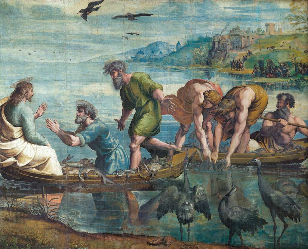 74. Raphaël (Raffaello Sanzio), 1483-1520, Italien. La Pêche miraculeuse, vers 1515-1516. Gouache sur papier monté sur toile, 31,9 x 39,9 cm. The Royal Collection, Londres. Haute Renaissance.