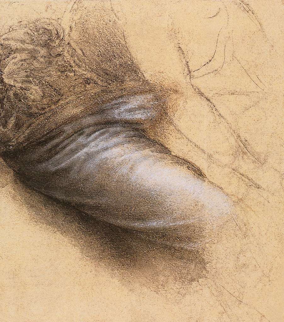 57. Léonard de Vinci, 1452-1519, Italien. Le Bras de la Vierge, vers 1508-1510. Craies noire et rouge, plume et encre, pinceau et encre, rehauts de blanc sur papier préparé rouge pâle, 8,6 x 17 cm. The Royal Collection, Londres. Haute Renaissance.