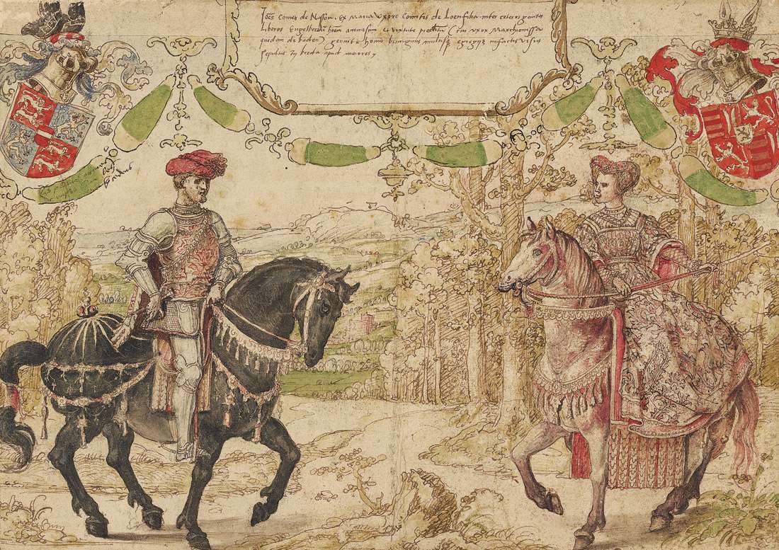 81. Bernaert Van Orley, vers 1488-1541, Flamand. Johan IV Van Nassau et sa femme Maria Van Loon-Heinsberg, vers 1528-1530. Plume, encre brune, aquarelle sur touches de craie noire, 34,9 x 49,1 cm. J. Paul Getty Museum, Los Angeles. Renaissance du Nord.