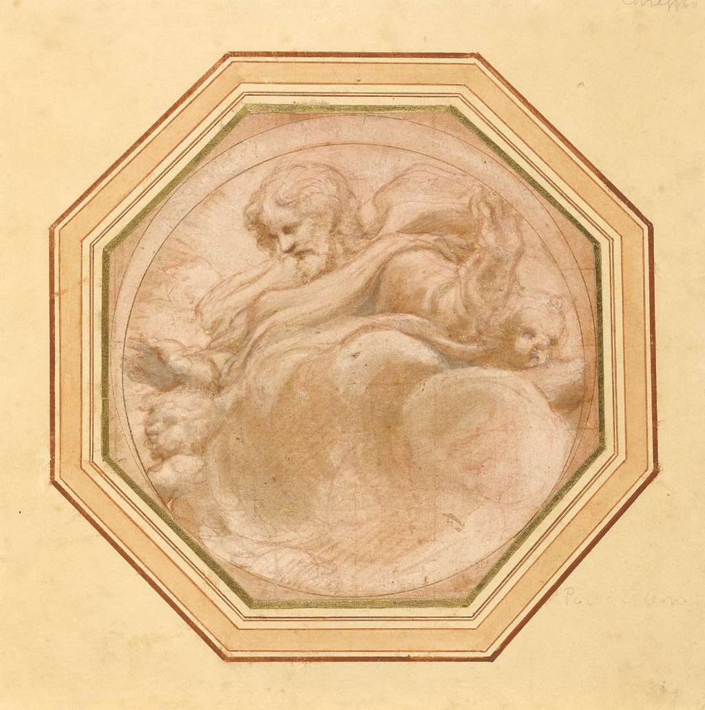 88. Le Corrège, vers 1489-1534, Italien. Le Christ en gloire, 1520-1523. Sanguine et lavis brun et gris avec rehauts de gouache blanche sur fond rose ; cercle inscrit à l’encre brune ; carré à la craie rouge, 14,6 x 14,6 cm. J. Paul Getty Museum, Los Angeles. Maniérisme.