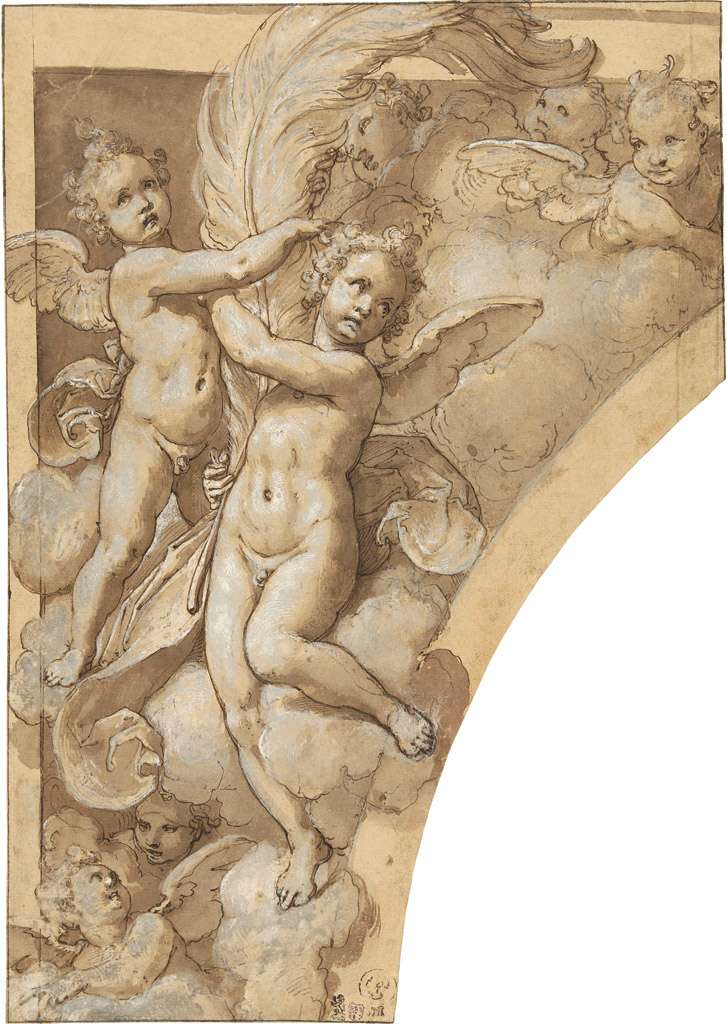 103. Taddeo Zuccaro, 1529-1566, Italien. Vol des anges, deux tiennent une grande plume, 1556-1558. Gouache et encre sur papier, 34,7 x 24,5 cm. Rijksmuseum, Amsterdam. Haute Renaissance.