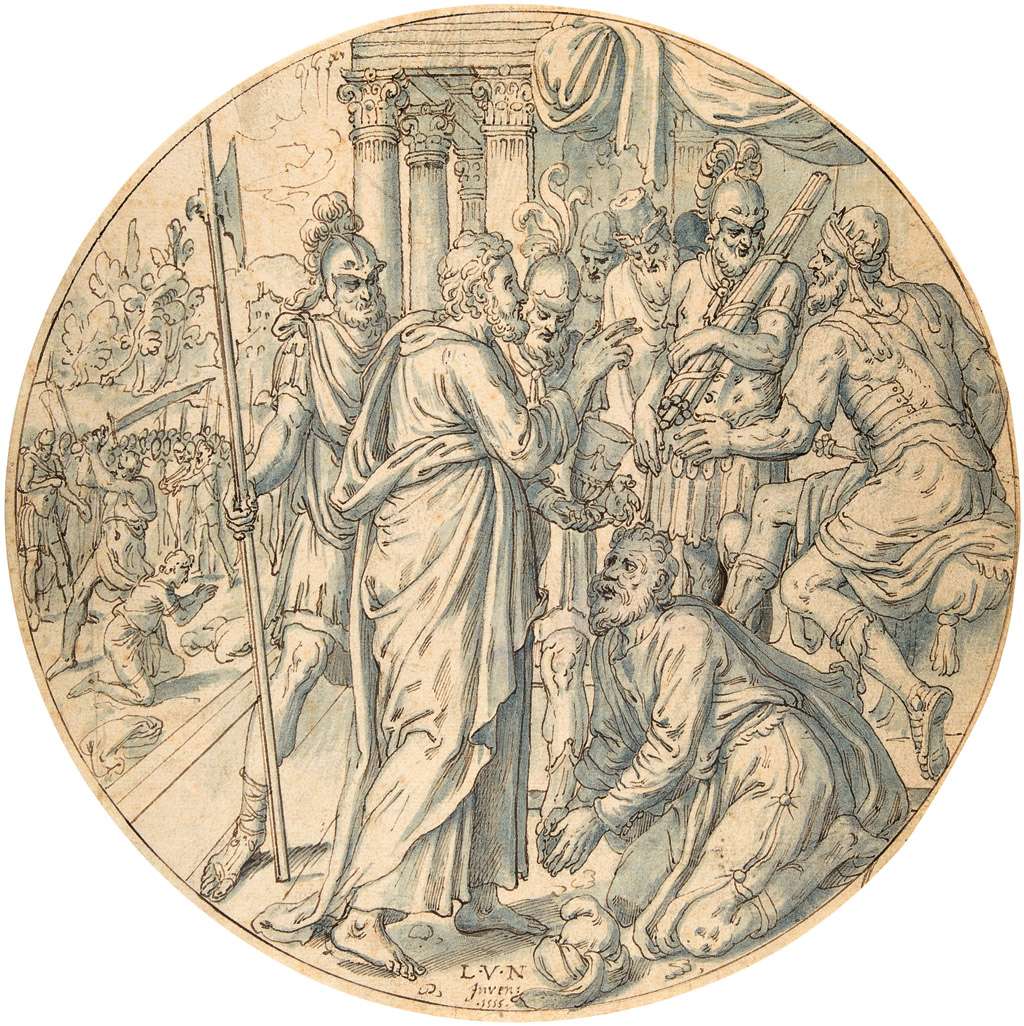 83. Maître de Konstanz (Christoph Bockstorffer), vers 1480/1489-1553, Suisse. Mucius Scaevola mettant sa main droite dans les flammes avant Lars Porsenna, vers 1530-1540. Pinceau et encre noire, gris et deux teintes de lavis jaune et craie rouge, 43,7 x 32,7 cm. J. Paul Getty Museum, Los Angeles. Renaissance du Nord.