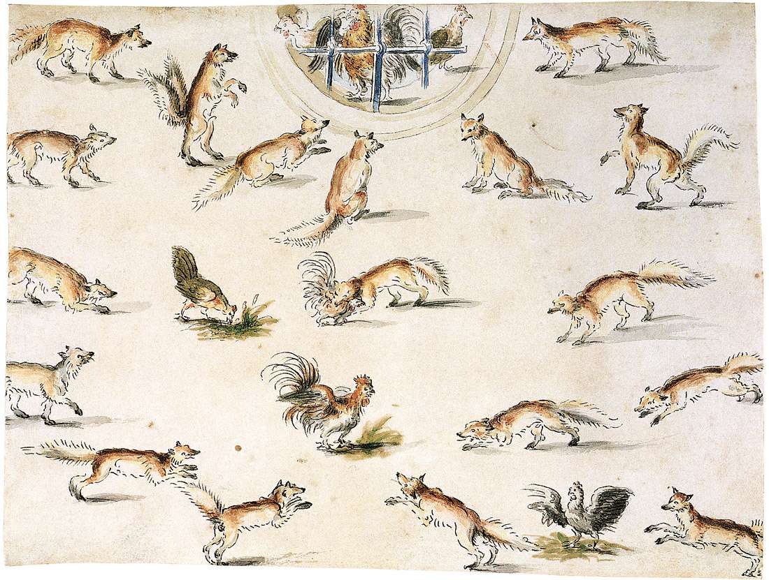 112. Lucas Cranach le Jeune, 1515-1586, Allemand. Feuille d’étude de renards, poules et coqs, vers 1565-1570. Mine de plomb, plume, encre brune et aquarelle, 21,3 x 28,7 cm. Museum der bildenden Künste, Leipzig. Renaissance du Nord.