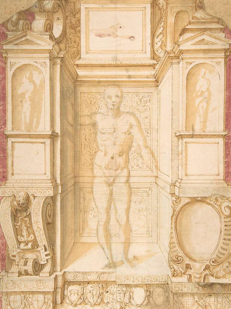 98. Le Parmesan (Francesco Mazzola), 1503-1540, Italien. Étude pour un personnage dans un décor architectural, vers 1531-1533. Plume et encre, avec lavis et rehauts de blanc sur dessin à la craie noire, 9,3 x 6,9 cm. The Royal Collection, Londres. Maniérisme.