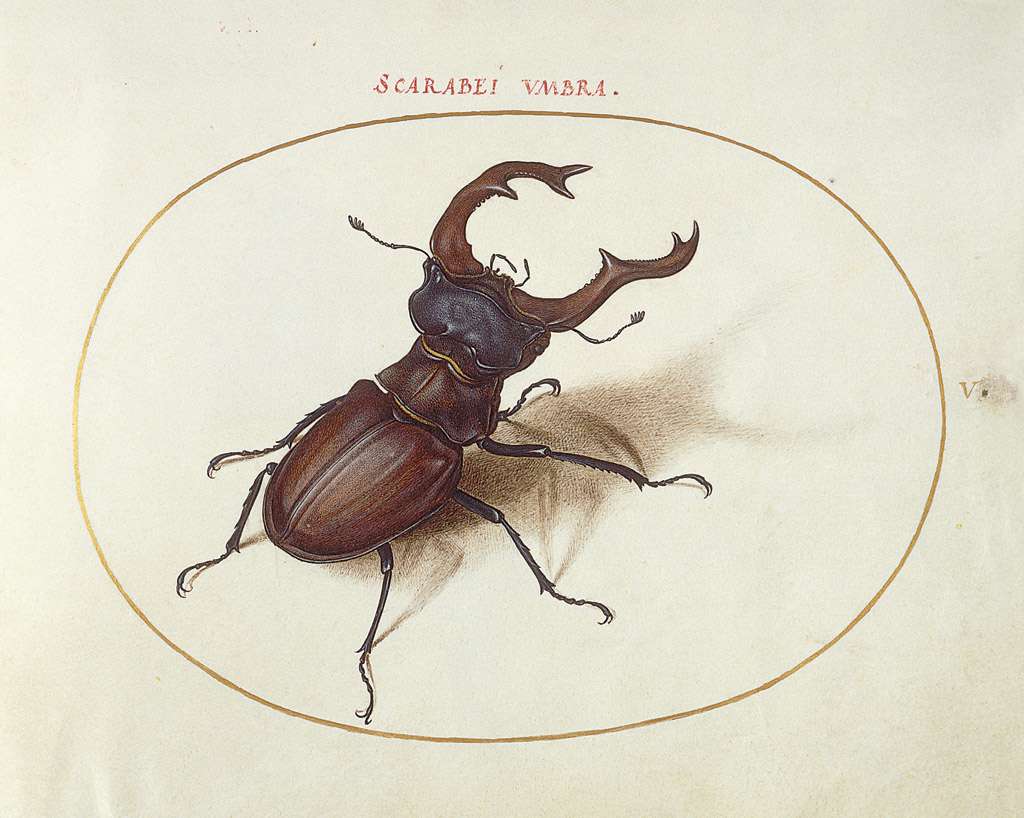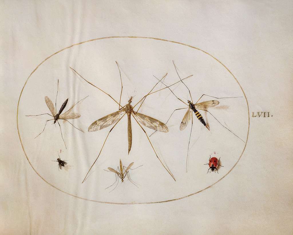 129. Joris Hoefnagel, 1542-1600, Néerlandais. Animalia Rationalia et Insecta (Ignis) : planche LVII, vers 1575-1580. Aquarelle et gouache, avec une bordure ovale en or, sur papier vélin, 14,3 x 18,4 cm. National Gallery of Art, Washington, D.C. Renaissance du Nord.