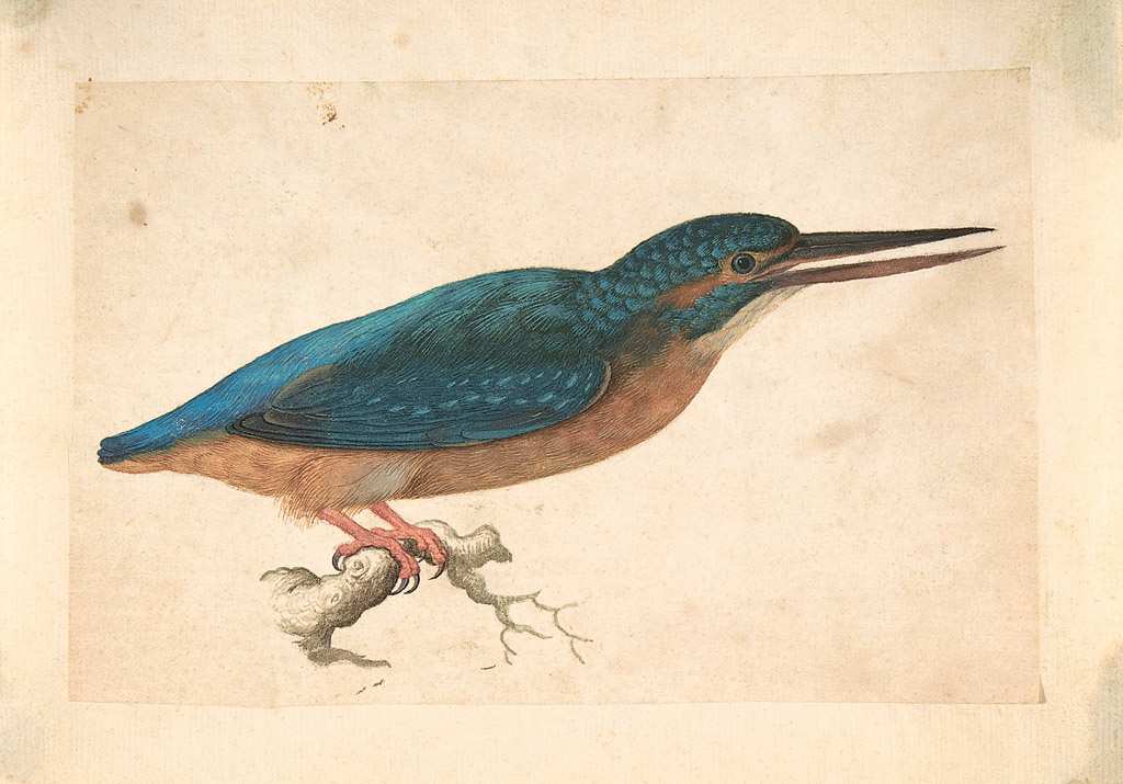 144. Jacques le Moyne de Morgues, 1533-1588, Français. Un Martin-pêcheur sur une branche, date inconnue. Aquarelle et gouache sur pierre noire, 11,5 x 18 cm. The Metropolitan Museum of Art, New York.