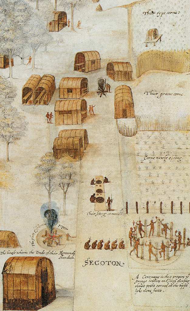 John White embarque en 1585 pour une expédition vers les côtes d’Amérique du Nord. C’est sur l’île de Roanoke dans la Caroline du Nord actuelle que les explorateurs débarquent. Au cours de ce séjour, John White représente le paysage et les peuples indigènes à l’aquarelle. Ces dessins vont être largement diffusés et annoncent les travaux des explorateurs du XVIIIe siècle. En 1587, lors d’une deuxième campagne, John White fut nommé gouverneur de Roanoke. Les habitants manquent très rapidement de vivres, John White se voit donc contraint de rentrer en Angleterre pour demander des ravitaillements. Il ne retournera sur l’île que deux ans plus tard et la découvrît déserte. Si la colonie de John White fut un échec, ses dessins aquarellés qui la représentent sont une des plus anciennes sources iconographiques figurant l’Amérique du Nord.