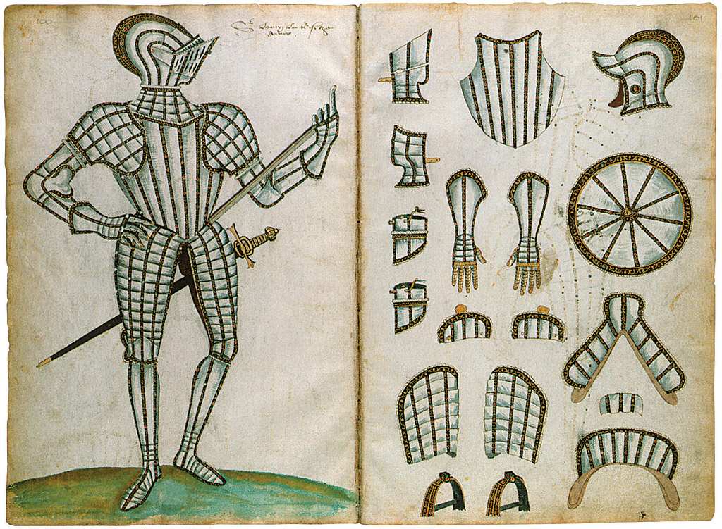 148. Jacob Halder, actif de 1557-1607, Anglais. L’Album d’Almain Armourer ; L’Album de Jacob ; « Le comte de Cumberland », vers 1587. Crayon, encre et aquarelle sur papier, deux feuilles, 42,5 x 28,8 cm. Victoria and Albert Museum, Londres. Renaissance anglaise.