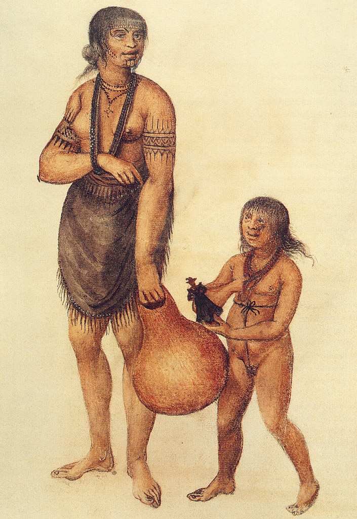 150. John White, actif de 1577-1593, Anglais. Mère et enfant Secotans en Caroline du Nord, vers 1585. Aquarelle. Bristish Museum, Londres.