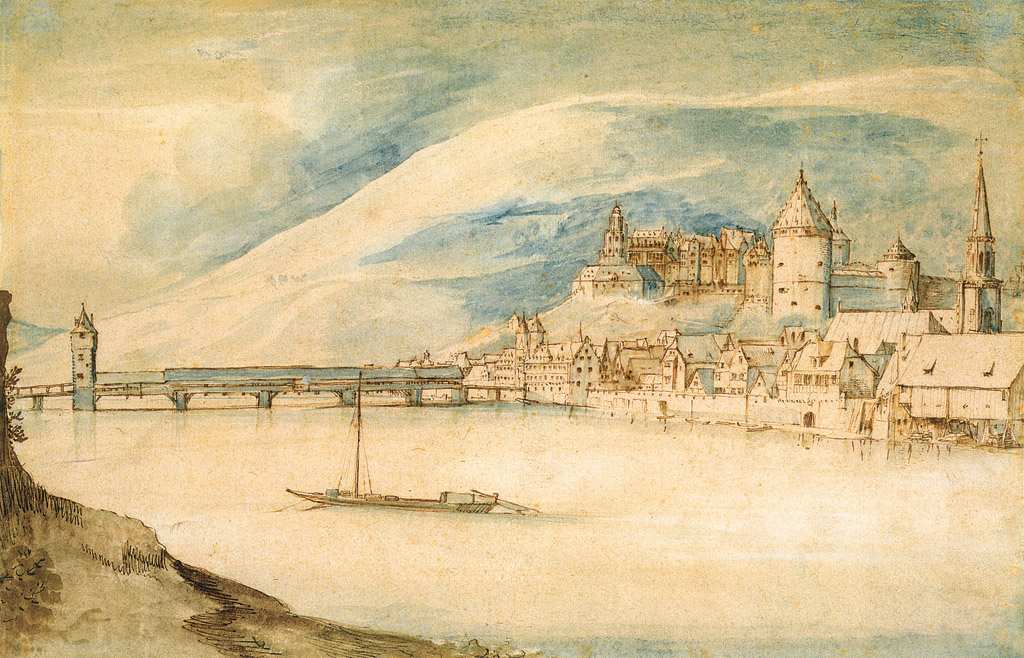 153. Jan Bruegel l’Ancien, 1568-1625, Flamand. Vue d’Heidelberg, 1588-1589. Plume, encre brune, pinceau, lavis bleu et marron et rehauts d’or, 20 x 30,5 cm. The Metropolitan Museum of Art, New York. Renaissance du Nord.