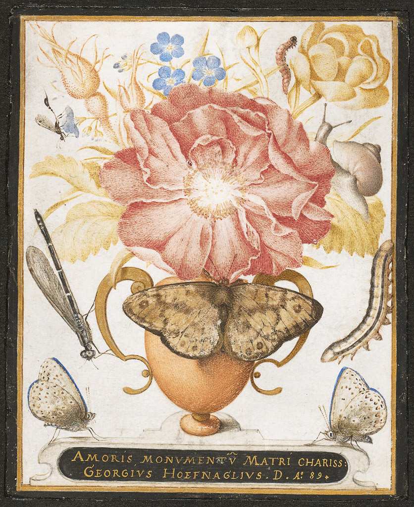 154. Joris Hoefnagel, 1542-1600, Néerlandais. Nature morte avec fleurs, un escargot et des insectes, 1589. Aquarelle, gouache, et coquille d’or sur papier vélin, 11,7 x 9,3 cm. The Metropolitan Museum of Art, New York. Renaissance du Nord.