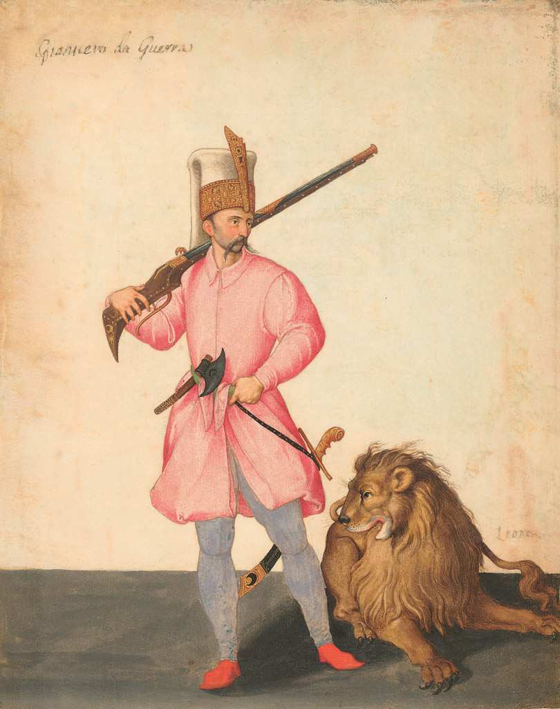 155. Jacopo Ligozzi, 1547-1626/1627, Italien. Un janissaire « de la guerre » avec un Lion, vers 1577-1580. Aquarelle, gouache, peinture dorée, gomme arabique et brunissage, 28,2 x 22,4 cm. The Metropolitan Museum of Art, New York. Maniérisme.
