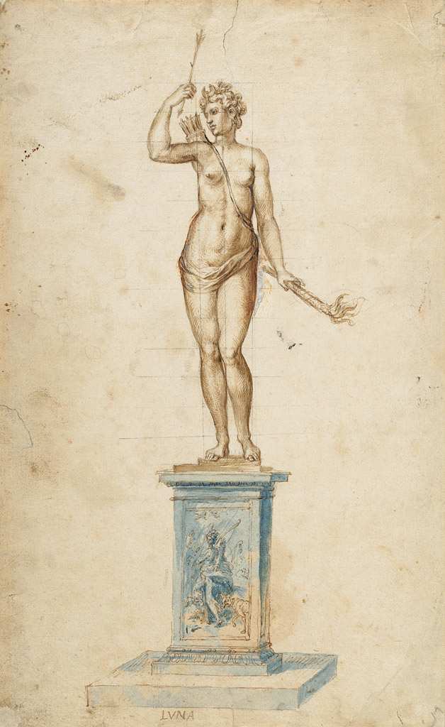 159. Jacques Jonghelinck, 1530-1606, Néerlandais. La Déesse Diane, vers 1570-1580. Plume et encre brune, lavis brun et bleu, craie rouge, gouache blanche sur pierre noire, 34,5 x 21,2 cm. The Metropolitan Museum of Art, New York. Maniérisme.