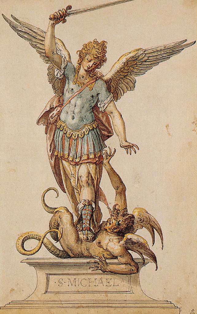 161. Friedrich Sustris, vers 1540-1599, Néerlandais. Ébauche pour une statuette en argent de saint Michel, vers 1600. Plume et encre grise foncée, aquarelle et rehauts blancs, 35,3 x 22,7 cm. Grafische Sammlung, Albertina, Vienne. Renaissance.