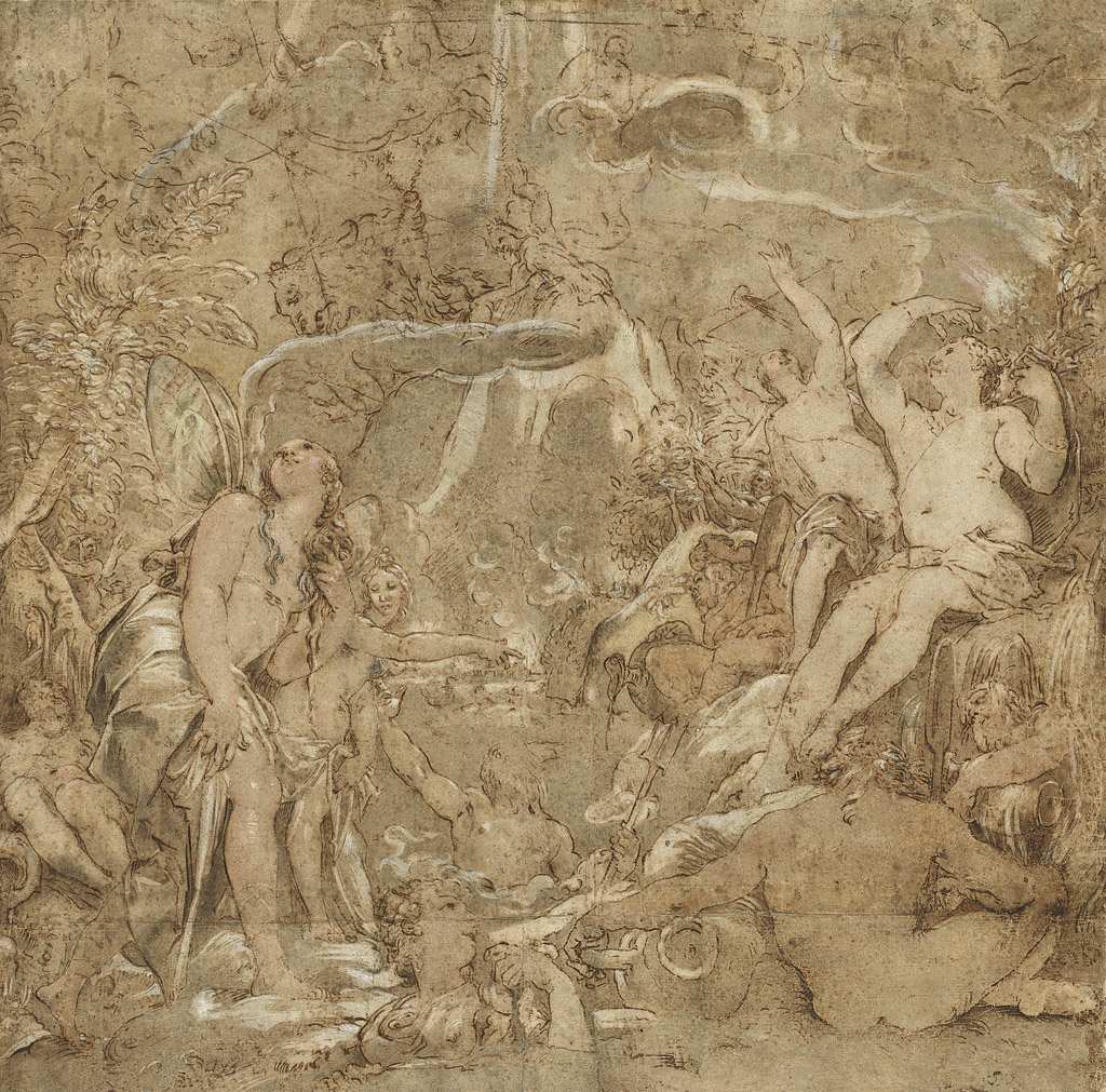 163. Joseph Heintz l’Ancien, 1564-1609, Suisse. Les Filles du Pô avec les dieux de la rivière, 1591. Plume et encre brune, lavis brun et aquarelle, rehauts de blanc, rouge et gouache verte, 61,5 x 62,8 cm. National Gallery of Art, Washington, D.C. Maniérisme.