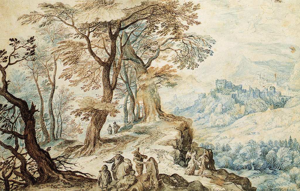 175. Jan Bruegel l’Ancien, 1568-1625, Flamand. Paysage avec Tobie et l’ange, vers 1595. Plume, encre brune, lavis brun et bleu, 20,2 x 31,3 cm. Szépmu”vészeti Múzeum, Budapest. Renaissance du Nord.
