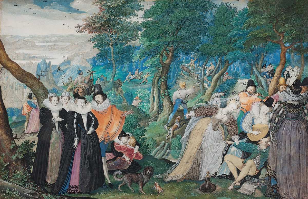 178. Isaac Oliver, vers 1565-1617, Anglais. Une Fête en plein air. Allégorie de l’amour conjugal, 1590-1595. Gouache et aquarelle sur papier vélin collé sur carton, 11,3 x 17,4 cm. Statens Museum for Kunst, Copenhague. Renaissance anglaise.