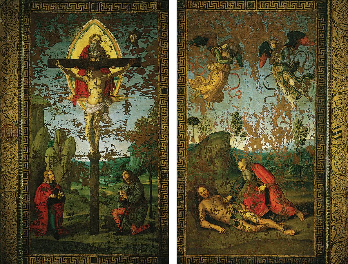 Dieses Banner existiert noch immer, allerdings in einem ruinösen Zustand. Es wurde aus der Trinitätskirche, für die es gemalt wurde, entfernt und in die Städtische Pinakothek von Città di Castello gebracht. Raffael sah es nicht als unter seiner Würde an, diesen Befehl zu akzeptieren, wissend, dass die berühmtesten Maler froh waren, diese Banner, die einen Ehrenplatz während der Prozessionen einnahmen und im Allgemeinen so gut bezahlt waren wie Ölgemälde, zu malen. Die Umbrische Schule hatte sozusagen ein Monopol auf sie, und Perugino gab seinem Schüler anhand von vierzehn kleinen Standarten für die Panicale-Kirche, in der sie für die Corpus Domini-Prozession verwendet wurden, ein Beispiel.