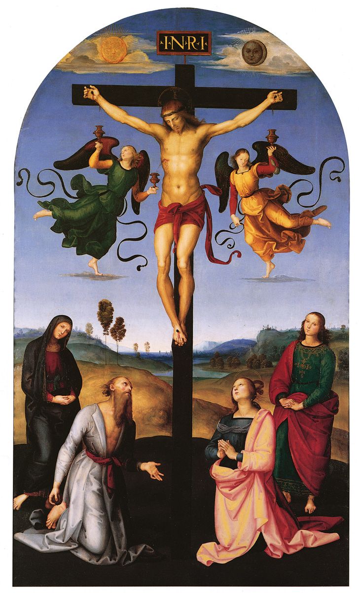 Die Mond-Kreuzigung, die von der Gavari-Kapelle der Dominikanerkirche über Umwege ihren Weg in die National Gallery in London gefunden hat, zählt zu den wichtigsten Werken Raffaels. Das Motiv entsprach zugegebenermaßen nicht dem Genius des Künstlers, dennoch ist es verständlich, dass er sich bereits entwickelter Ideen bediente. In dem Maße, wie er bei der Darstellung von Würde und Schönheit seinen Geist und seine Inspiration zeigt, zeugen seine Werke von der Unentschlossenheit bei der Darstellung von Leidenschaft und Trauer, und zwar zu jedem Zeitpunkt seiner jungen Schaffensjahre, sodass man der Vorstellung verfällt, dass es für Leid und Übel in einer solch himmlischen Seele keinen Platz gab.