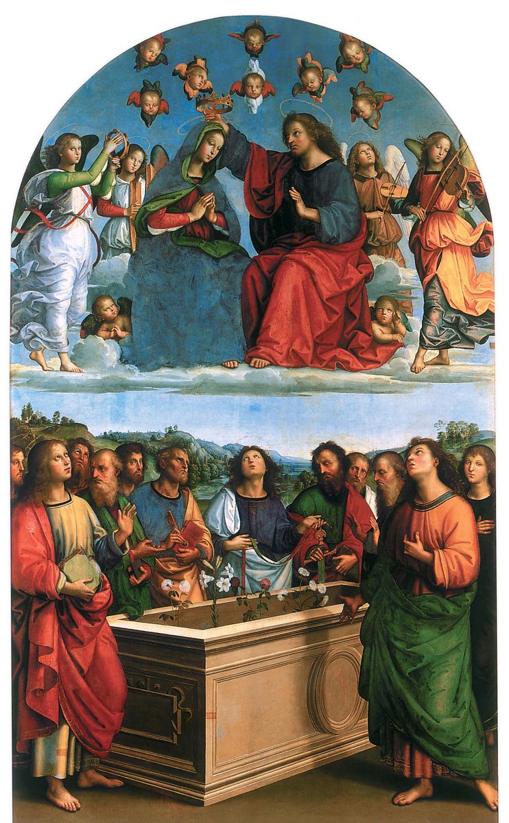 Kurz nach der Abreise seines Meisters (Perugino) beauftragte eine Dame aus einer der wohlhabendsten Familien Perugias, Maddalena degli Oddi, Raffael, die Krönung Mariä für die Kirche des heiligen Franziskus zu malen. Da die Oddi nach dem Sturz Cesare Borgias im August 1503 verbannt wurden, muss dieses Werk im Frühjahr desselben Jahres beendet worden sein. Das Bild setzt sich aus zwei Partien zusammen. Die eine zeigt die um das Grab der Jungfrau versammelten Apostel, genau wie in Darstellungen der Mariä Himmelfahrt, die andere zeigt den auf Wolken sitzenden Christus inmitten einer Engelsglorie, der eine Krone auf das Haupt seiner Mutter setzt. Einige der Apostel blicken nach oben, wo der Betrachter Christus und seine Mutter sieht. Diese Haltung reicht aus, um eine Verbindung zwischen den beiden Szenen herzustellen und somit dem Werk den Eindruck von Einheit zu verleihen.