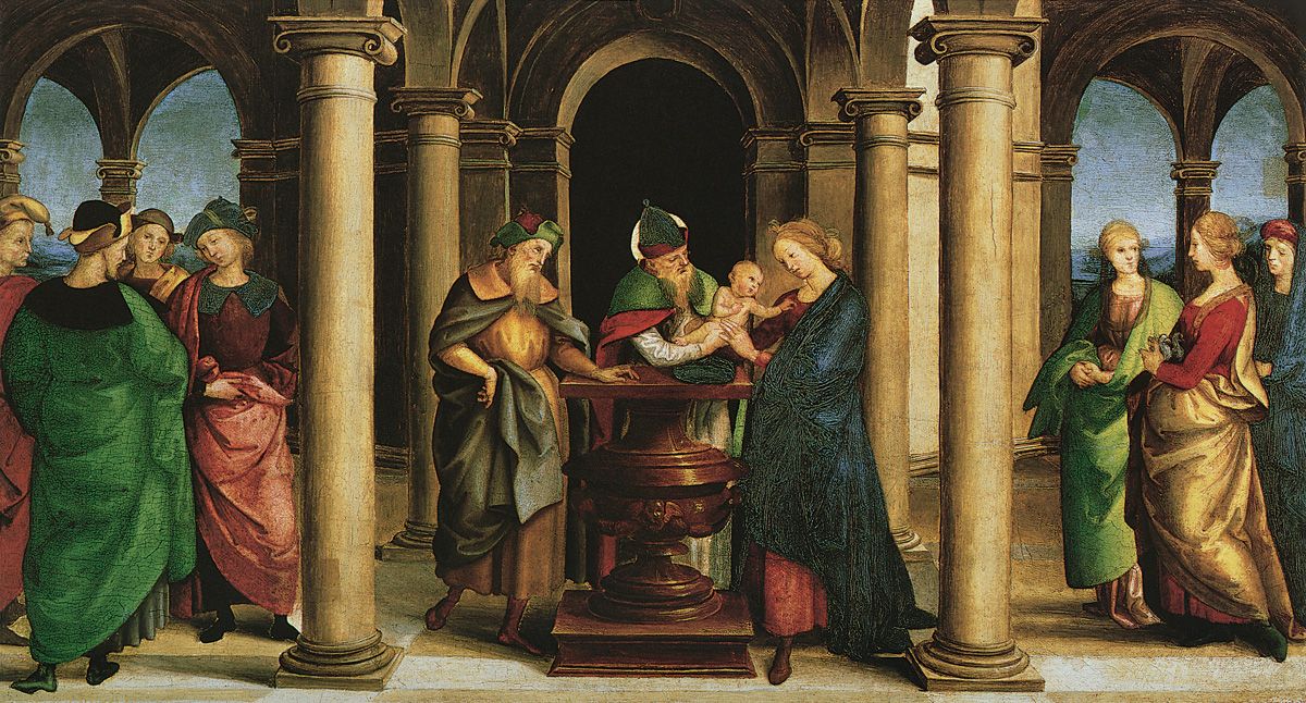 Hier wie auch in der Verkündigung wählte Raffael einen gleichzeitig einfachen, aber beeindruckenden architektonischen Rahmen. In der Bildmitte steht der gealterte Simeon, der die einzige Person mit einem Heiligenschein ist und von Maria das neugeborene Jesuskind mit einer anmutigen und bescheidenen Geste entgegennimmt. Doch das Kind fürchtet sich vor dem Fremden und dreht sich in Richtung seiner Mutter und streckt die Arme aus, als würde es um ihre Hilfe flehen. Hier zeigt sich die Natürlichkeit, die Raffaels Beobachtungsgabe bezeugt. Josef von Nazaret vervollständigt die Gruppe, deren Anordnung perfekt ist. Am linken und rechten Rand des Bildes befinden sich zum einen die Männer und zum anderen die Frauen, von denen eine die traditionellen Turteltauben als Geschenk trägt. Die Gewänder entsprechen denen des 15. Jahrhunderts: rote, schwarze oder grüne Schuhe, fantasiereich geformte Filzhüte und lange Mäntel.