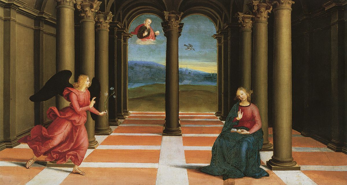 Die Szene, in der Maria von dem himmlischen Boten die Gewissheit ihrer zukünftigen Größe erhält, findet unter einer erhabenen und eleganten, von korinthischen Säulen getragenen Portikus statt. Es weht ein ungehinderter Luftzug durch dieses wunderbare und harmonische Stück Architektur, das von der Renaissance erzählt, und die ruhige Landschaft im Hintergrund fügt sich in die Heiterkeit und Geräumigkeit der Komposition ein. Ein Rahmen dieser Art war dazu gedacht, die Figuren hervorzuheben, sodass Raffael sie nicht vervielfältigen musste, um die Aufmerksamkeit auf sie zu lenken. Rechts sitzt die Jungfrau mit einem Buch auf ihren Knien, leicht den Kopf beugend und voller Offenheit und Ergebung; von links bewegt sich ein Engel, das Gesicht voller Freude, zügig auf sie zu; und im Hintergrund steigt Gottvater empor und bestätigt die Verheißung seines Boten; dies sind die einzigen Akteure dieser Szene, zugleich so vollendet und harmonisch.