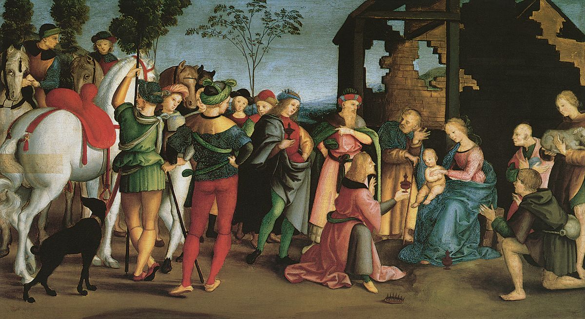 In einem solchen Thema steckte viel, das einen jungen Maler zugleich reizte und einschüchterte, aber Raffael ließ sich von der letzteren Überlegung nicht zurückhalten und schritt entschlossenen Mutes zur Tat. Für ein Gemälde aus der Umbrischen Schule, das diesem in Lebendigkeit, Bewegung, Anmut und Kraft gleichkommt, muss man bis zur 1423 von Palla Strozzi gemalten Anbetung der Könige zurückgehen, das bei seiner Erscheinung die wärmsten Bewunderungen unter den Künstlern Florenz‘ hervorrief. Diese beiden innerhalb eines Zeitraums von achtzig Jahren gemalten Bilder zeichnen sich durch das gleiche Feuer und überschwängliche Leben der männlichen Figuren, wie die gleiche exquisite Anmut der Figur der Jungfrau aus; dazu die gleiche Lebhaftigkeit, die allerdings im Falle Raffaels, der die Anzahl der Personen von siebzig auf fünfzehn reduzierte und mit einfacheren Mitteln ähnlich ergreifende Effekte erzielte, konzentrierter erscheint. Rechts, neben einer verfallenen Hütte, sitzt die Jungfrau mit ihrem Sohn auf dem Schoß, dem einer der Könige kostbare Geschenke darbietet. Hier übertrifft Gentile seinen jungen Rivalen. In seinem Bild küsst der älteste der Weisen, ausgestreckt vor dem Jesuskind, demütig seine Füße, während das Kind feierlich seine Hand auf den Kopf des Anbeters legt. Diese Szene, die durch den Reichtum der Gewänder erhöht wird, hat eine Feierlichkeit an sich, an der es Raffaels Werk mangelt, und wirkt wie ein finales Echo der Herrlichkeit des Mittelalters. Die Jungfrau strahlt vor Freude, während die Haltung und das Gesicht des Kindes sowohl Neugierde als auch Überraschung ausdrücken. Hinter der Hauptgruppe platzierte Raffael, einer seiner kühnen Eingebungen folgend, drei Schäfer, die durch die Einfachheit ihrer Kleidung und die Bescheidenheit ihrer Gabe (ein Lamm) in Kontrast zur Herrlichkeit der drei Könige stehen. Bis dahin waren die beiden Szenen – die Anbetung der Könige und die der Hirten – immer separat dargestellt worden. Indem er sie miteinander verband, zeigte der Künstler, wie sorgfältig er die Bedeutung des Evangeliums gemeistert hatte und wie gut er gelernt hatte, den menschlichen und berührenden Teil seiner Seiten hervorzubringen.