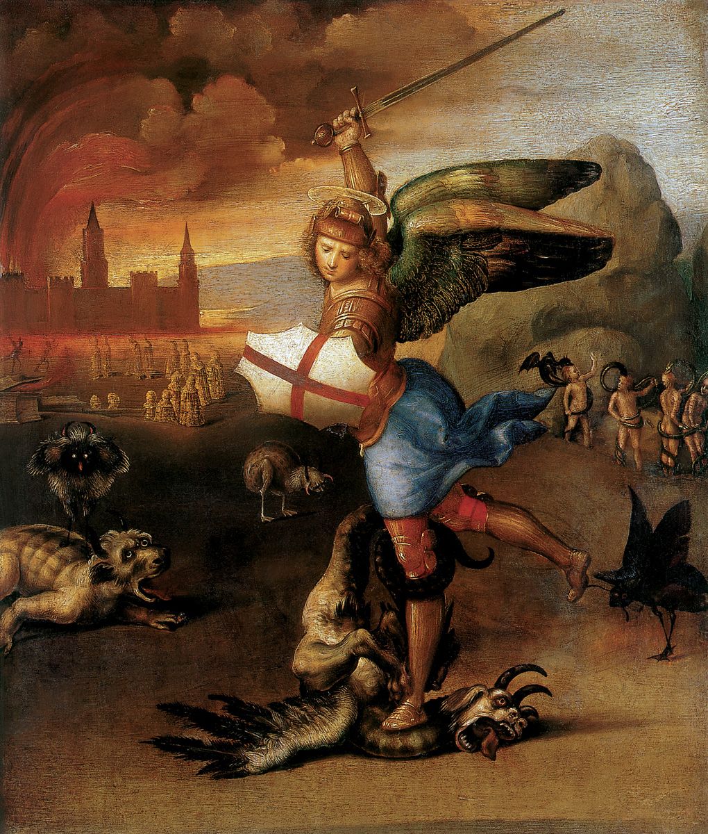 Das Gemälde des heiligen Michaels ist von anderer Art, denn während der heilige Georg mitten im Kampf dargestellt ist, ist der Triumph des Erzengels unbestritten. Er braucht kein stolzes Schlachtross, das alleine ausgereicht hätte, um das erste Bild zu verewigen, und seine Rüstung scheint ihm mehr zur Zierde als zur Verteidigung gegeben worden zu sein. Er hätte den Schild, der seinen linken Arm schützt, mit rotem Kreuz auf weißem Grund, entbehren können, denn wie der Bote der göttlichen Gerechtigkeit fliegt er vom Himmel herab und setzt seinen Fuß auf den Dämon, der vergeblich gegen ihn ankämpft. Er muss nur das Schwert, das er in der rechten Hand hält, senken, um den ungleichen Kampf zu beenden. Seine Schönheit, sein ruhiges Gebaren und das Licht, das ihn umgibt, zeigen, dass sein Sieg ein rein moralischer ist, und um den übernatürlichen Charakter der Szene hervorzuheben, lässt Raffael sie mitten in der Hölle stattfinden. Eine scheußliche Eule, schreckliche Drachen, Verdammte, die von Schlangen verschlungen oder von der Last bleierner Umhänge zu Boden gedrückt werden, bilden das Gefolge Satans, und eine Stadt in Flammen wirft ihr unheimliches Licht auf den Hintergrund.