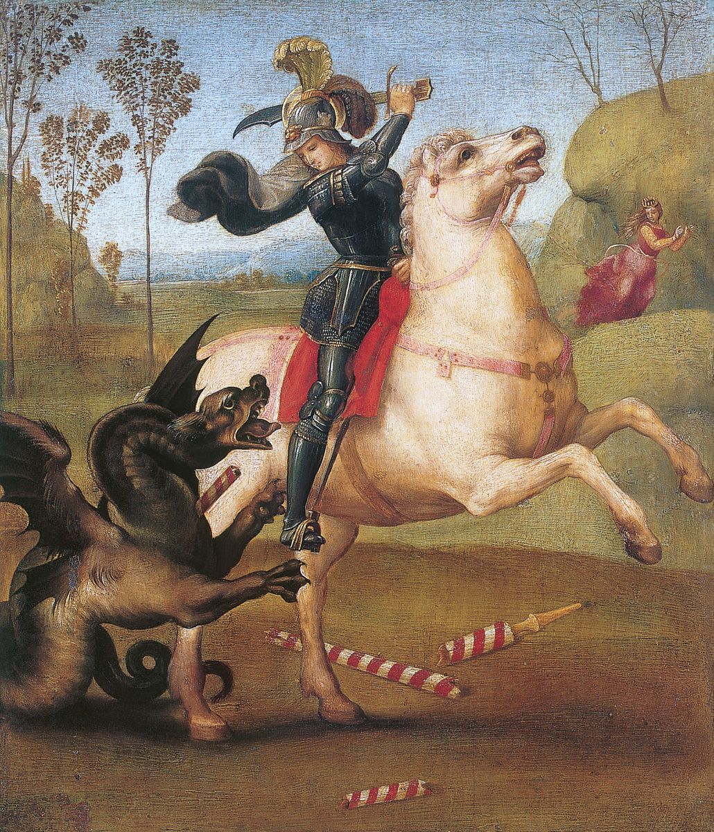 Der heilige Georg im Kampf mit dem Drachen ist ein Meisterwerk des Kolorits und des Bildaufbaus. Raffael zeigt dem Betrachter durch seine vernünftige Wahl an Tönen und seinen kraftvollen und deutlichen Pinselstrich, dass er gleichermaßen als Maler und als Zeichner in seinem Element war. Nichts ist feiner und harmonischer als dieses Bild, dessen Details allesamt komplett ausgearbeitet sind. Der rote Sattel bringt das Weiß des Pferdes zur Geltung, das wiederum in Kontrast zur stählernen Rüstung des Heiligen steht. Ferner sind es die roten und weißen Fragmente der Lanze, die die dunklen Töne der Landschaft aufhellen und helfen, der gesamten Szene eine wunderbare Menge an Bewegung und Stimmung zu verleihen.