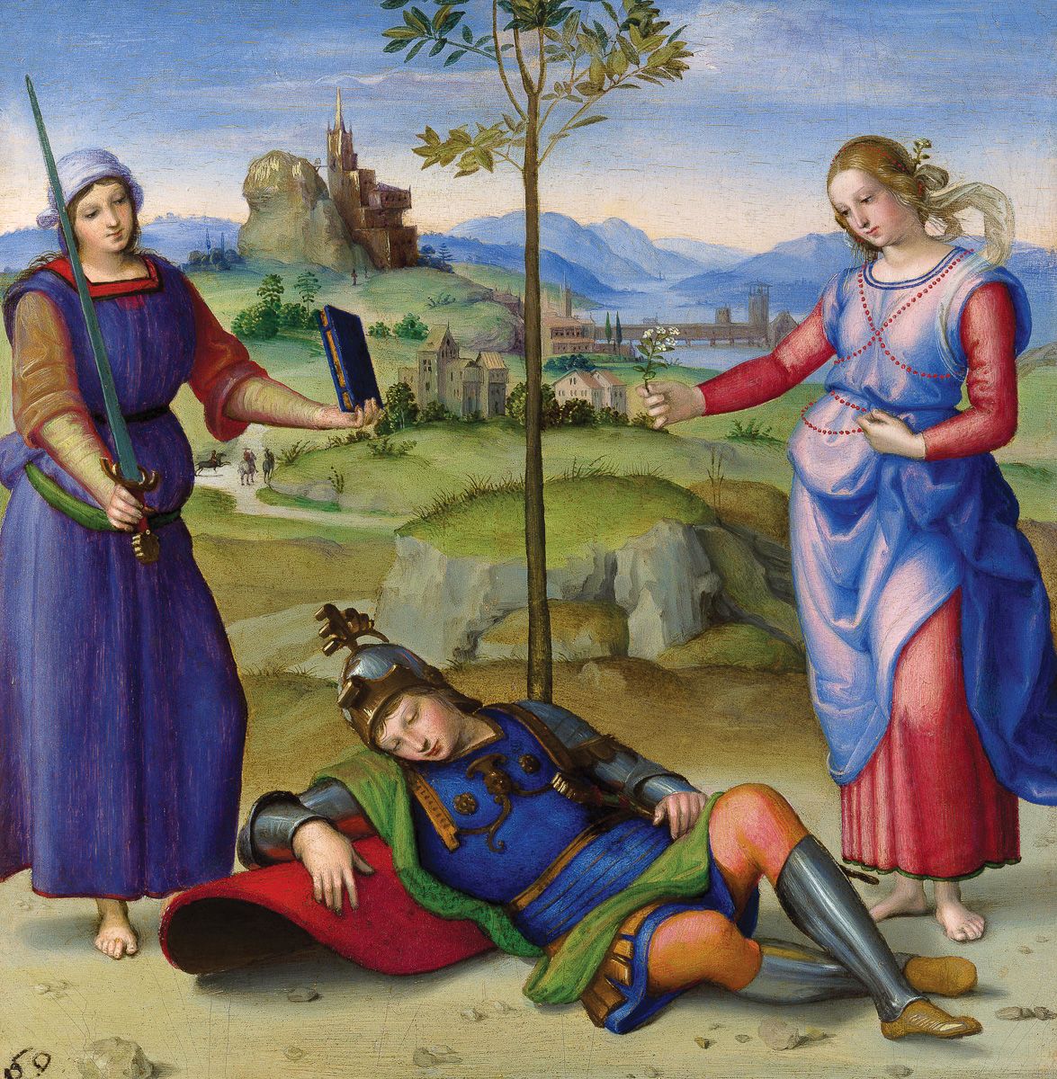 Erschöpft von den Anstrengungen einer langen Reise, schläft ein Ritter, der sowohl reich an Begabungen als auch an Illusionen der Jugend ist, unter einem Lorbeerbaum. Wie ein echter Krieger hat er seine Rüstung nicht abgelegt und benutzt sein Schild als Kissen. Während er schläft, erscheinen ihm zwei Frauen, die beide wunderschön sind, sich aber in ihrer Mimik unterscheiden. Die eine wirkt, trotz eines Ausdrucks von Anmut, nachdenklich und ernst, und hält ihm ein Schwert und ein Buch entgegen, als wollte sie ihn zu kriegsähnlichen Handlungen und zum Studium anspornen. Ihre gelbe Tunika und ihr langes, lilafarbenes Gewand geben ihrer Erscheinung zusätzliche Vornehmheit. Die andere, ihre Gegenspielerin, trägt ein koketteres Gewand. Der rote Farbton ihrer Tunika bringt den Glanz ihres blauen, rosafarben schillernden Kleides hervor; um ihren Hals trägt sie eine korallenrote Kette und ein weißer Schleier flattert an ihrem Hinterkopf, während sie in ihrer Hand eine Blume hält, das Symbol des Spiels, der Freuden und weltlicher Vergnügungen. Es ist die Wollust, zumindest so, wie sie der arglosen Vorstellungskraft Raffaels entsprang; sie ist eher das Gegenteil von Strenge als das von Reinheit und repräsentiert den Genius der Antike im Gegensatz zu dem des Christentums. Solche Gedanken müssen ihm, als er Umbrien verließ, mehr als einmal durch den Kopf gegangen sein. Nicht, dass er jemals bei der Wahl zwischen Vergnügen und Arbeit zögerte, aber vor ihm tat sich eine neue Welt auf, und innerhalb der profanen Gesellschaft, die er in Urbino und Florenz frequentierte, gab es mehrere Überzeugungen, die er gezwungen war zu opfern. Diese komplexen Kämpfe waren es, die Raffael in seinem schlafenden Ritter darstellen wollte, doch während er nur beabsichtigte, seine eigenen Gefühle zu zeigen, zeichnete er eine ewig wahre und beredte Geschichte. Das ist das Privileg eines Genies.