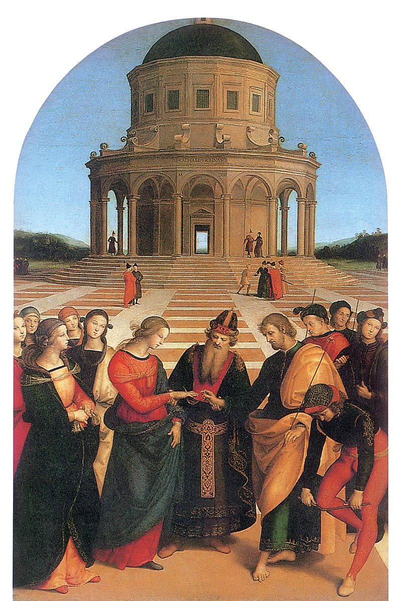 Die Vermählung Mariens wurde 1504 für die Kirche des heiligen Franziskus gemalt. Auf allen Bildern, die dieses Motiv zeigen, ist die Anordnung beinahe identisch; in der Bildmitte steht der Hohepriester, der die Hände der Verlobten hält, um sie zusammenzuführen, während rechts und links die Rivalen Josefs ihre Enttäuschung zeigen, indem sie den Stab brechen, der keine Blüte hervorgebracht hat, und die Begleiterinnen Marias mit einer Haltung von Zufriedenheit oder Versonnenheit zuschauen; den Hintergrund bildet ein in einer Landschaft stehender Tempel.