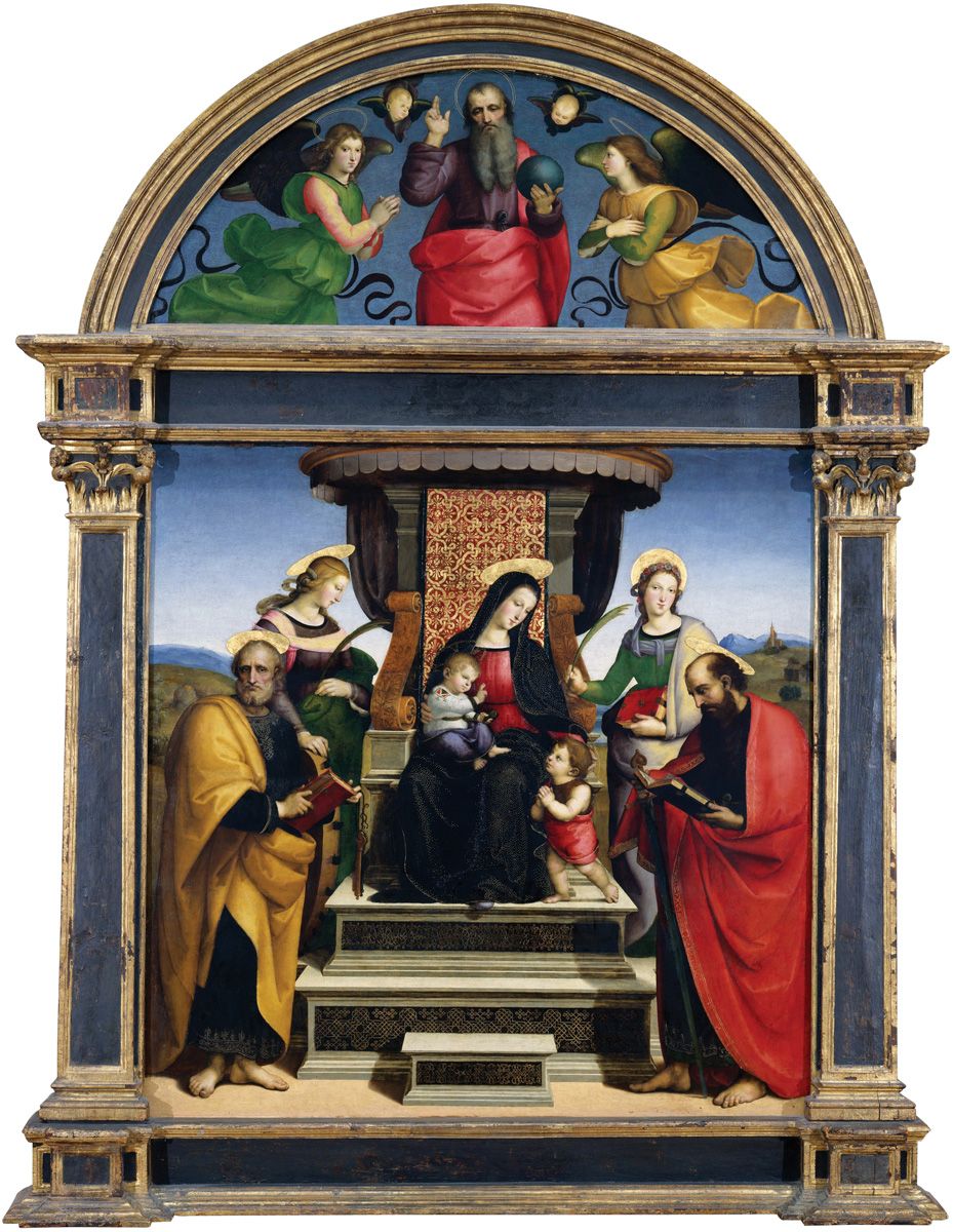 Im Zwickel, der das Retabel überragt, stellt Raffael Gottvater dar, der mit der einen Hand seinen Segen erteilt und in der anderen eine Erdkugel hält. An seiner Seite schweben zwei Cherubim, während zwei Engel – einer mit auf der Brust gekreuzten Händen, der andere in einer Betstellung – mit ausgestreckten Flügeln ihren Schöpfer anbeten. Nie zuvor hatte Raffael ein Werk in solcher Perfektion im Detail und Harmonie im Ganzen angefertigt, und schaffte es von nun an, den Ausdruck des Lebens mit dem der Schönheit zu verbinden. Seine Charaktere erlangten Individualität, sie wurden zu lebendigen Wesen; es gibt eine unendliche Vielfalt in den ausgedrückten Gefühlen, von der schaurigen Majestät Petri zur undefinierbaren Verträumtheit der beiden weiblichen Heiligen.