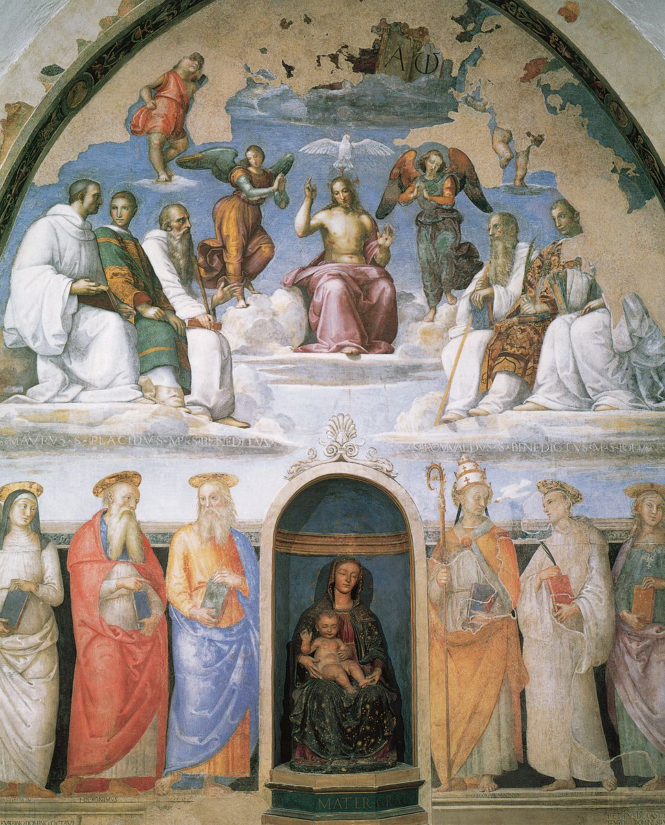 Die Anfrage der Kamaldulenser aus Perugia, Raffael möge eine der Sakristeiwände der Kapelle von San Severo ausschmücken, nahm dieser freudig an. Er war jedoch sehr besorgt, sich an der Freskomalerei zu versuchen. Das ausgewählte Motiv war die Versammlung der Ordensheiligen um die geheimnisvolle Dreifaltigkeit.