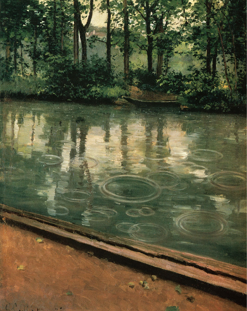 À la fin des années 1870, le style de Caillebotte subit des transformations. Il offre progressivement une plus grande importance à la représentation de la lumière et de l’atmosphère, et utilise une palette plus légère. Il dérive d’un style réaliste vers un style plus pittoresque. Avec un coup de pinceau plus doux et un choix de couleurs aux contours moins agressifs, il adapte de plus en plus son style aux impressionnistes. L‘influence impres-sionniste sur Caillebotte est particulièrement évidente dans l’intégration de la réflexion de la lumière, notamment dans le phénomène de miroir, qu’il traite souvent. Dans ses œuvres, il a étudié la diversité des surfaces réfléchissantes. Une variété de légers points s’invitent dans nombre de ses peintures. Dans sa répétition des plans d’eau, la lumière et les points de couleurs sont noyés en une masse de couleurs. Le ciel et les arbres qui poussent sur le bord de la rivière se reflètent dans l’eau, le cadre de la fenêtre se reflète sur le parquet lisse, et dans ses scènes de boulevard, les contours des piétons émergent sur les pavés mouillés.