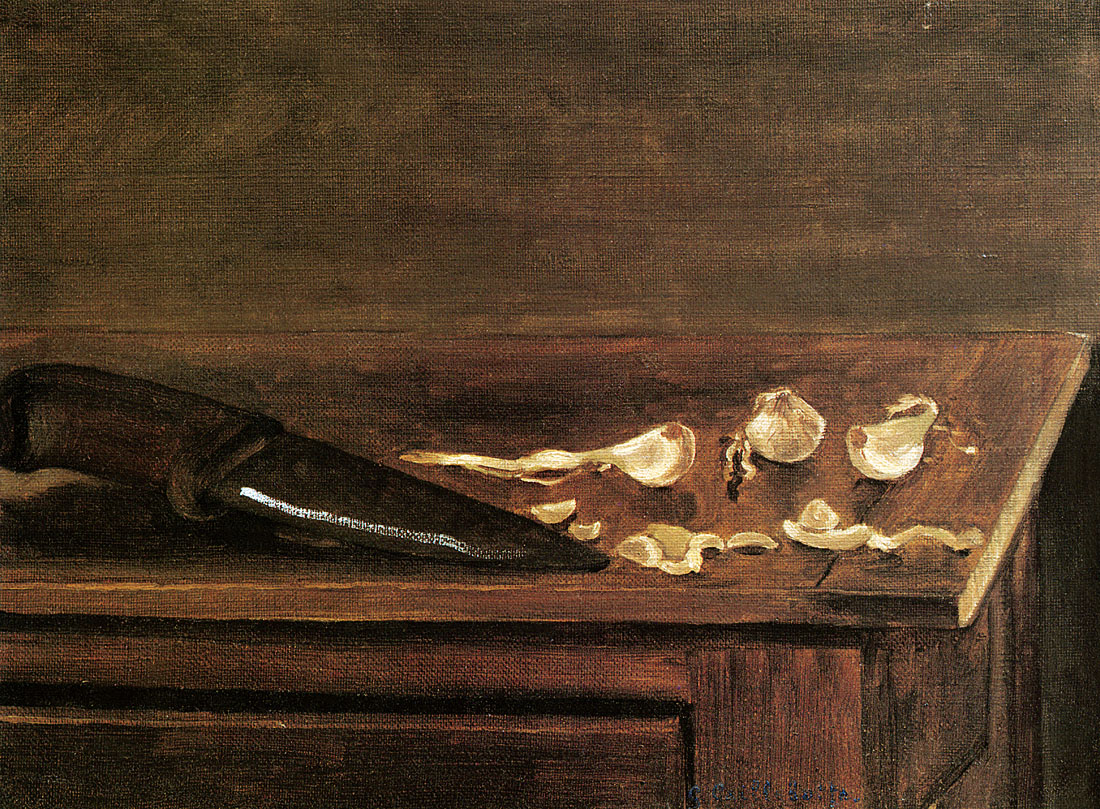 Gousses d’ail et couteau à l’angle d’une table, avant 1879