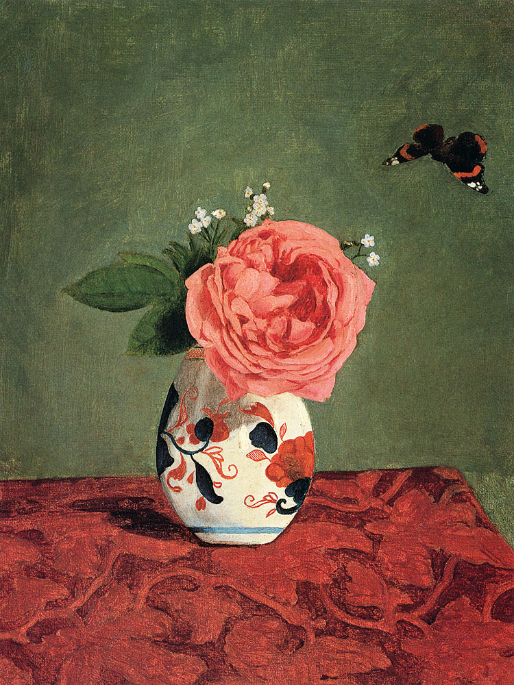 Rose de jardin et myosotis bleus dans un vase, avant 1879