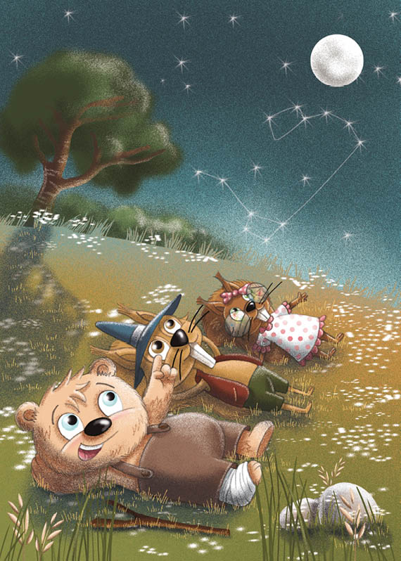Osito color canela nunca se sintió tan seguro. Sin pensarlo, se puso en pie y la rama que hasta ese entonces le sirvió de apoyo la arrojó con firmeza. En dos patas y sin temor, se dispuso a caminar en dirección a donde las estrellas le indicaban. Sus nuevos amigos lo seguían admirados por su firmeza.