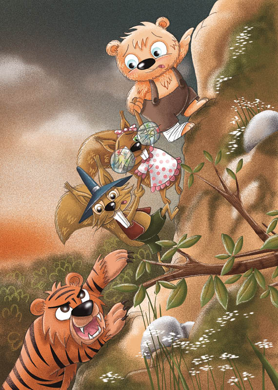 Se les acababa el tiempo, sin pensarlo, Osito empezó la escalada. La dificultad, mientras ascendían, era cada vez mayor. El tigre Tukan ya se hallaba a pocos metros de ellos y, al ver cómo pretendían escapar, también se dispuso a trepar.